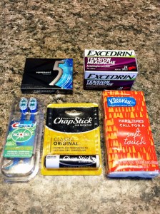 GOOD gum.  Many of these items I was able to get at my dollar store, but a few things I specifically hit up the grocery instead, because quality mattered.  Imagine your breath already reeks from days blending into nights blending into days of eating whatever you can wherever you can, and usually washing it down with a steady flow of whatever coffee is most readily available.  Well then you’re talking to doctors and techs and asking questions of the nurses, and let’s just not have to worry about whether or not they can smell that you haven’t brushed in 3 days.  Splurge for a gum with a powerful flavor that’s going to l a s t.  I love the 5 brand flavors.  Especially their mints are super strong and not only wake you up and freshen your breath, but you’re more likely to spit it out because you’re tired of chewing rather than the flavor having worn out.  Again with the eating and the coffee comes along these handy little disposable mini toothbrushes, pre-loaded with toothpaste.  Come on.  Those have to have been invented with the hospital parent in mind.  CHAPSTICK!  Basically my security blanket, I think most women and some men would agree it’s always good to have some within arms length.  Excedrin tension headache is what I picked, but any similar product that’s going to fight a headache or an ache or pain could be a daysaver for one of these parents.  As I mentioned before, the hospital is too legally bound to slip you a few Tylenol, and most parents are probably just going to suck it up and fight through the rest of the day trying not to think about their throbbing head or aching muscles from standing vigil for 11 hours.