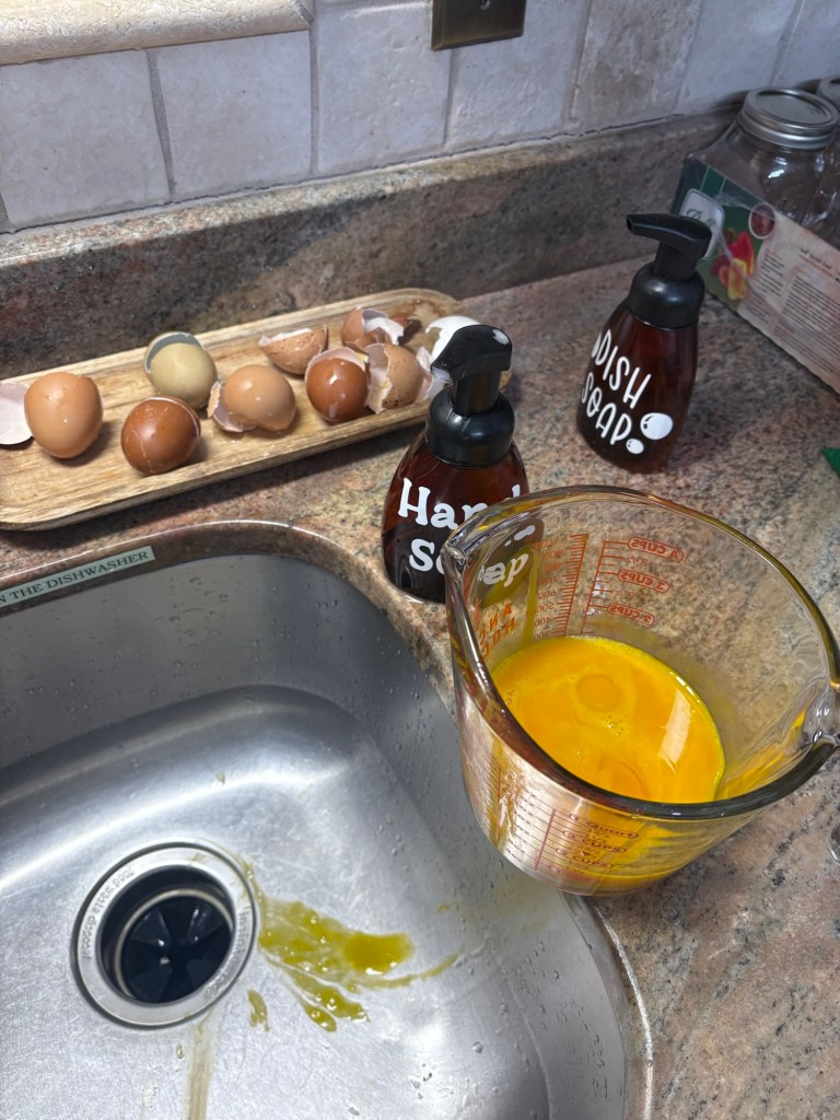 I got a hint of an exasperated eye roll, but then sleeves were rolled up and small hands reached for the first egg, still glistening with the last coat of cold water. One by one the eggs connected with the counter, shells cracked, yolks plopped into the glass pitcher. 8 eggs, several shell splinters, and two hands covered in gummy slime later, there was a smile.