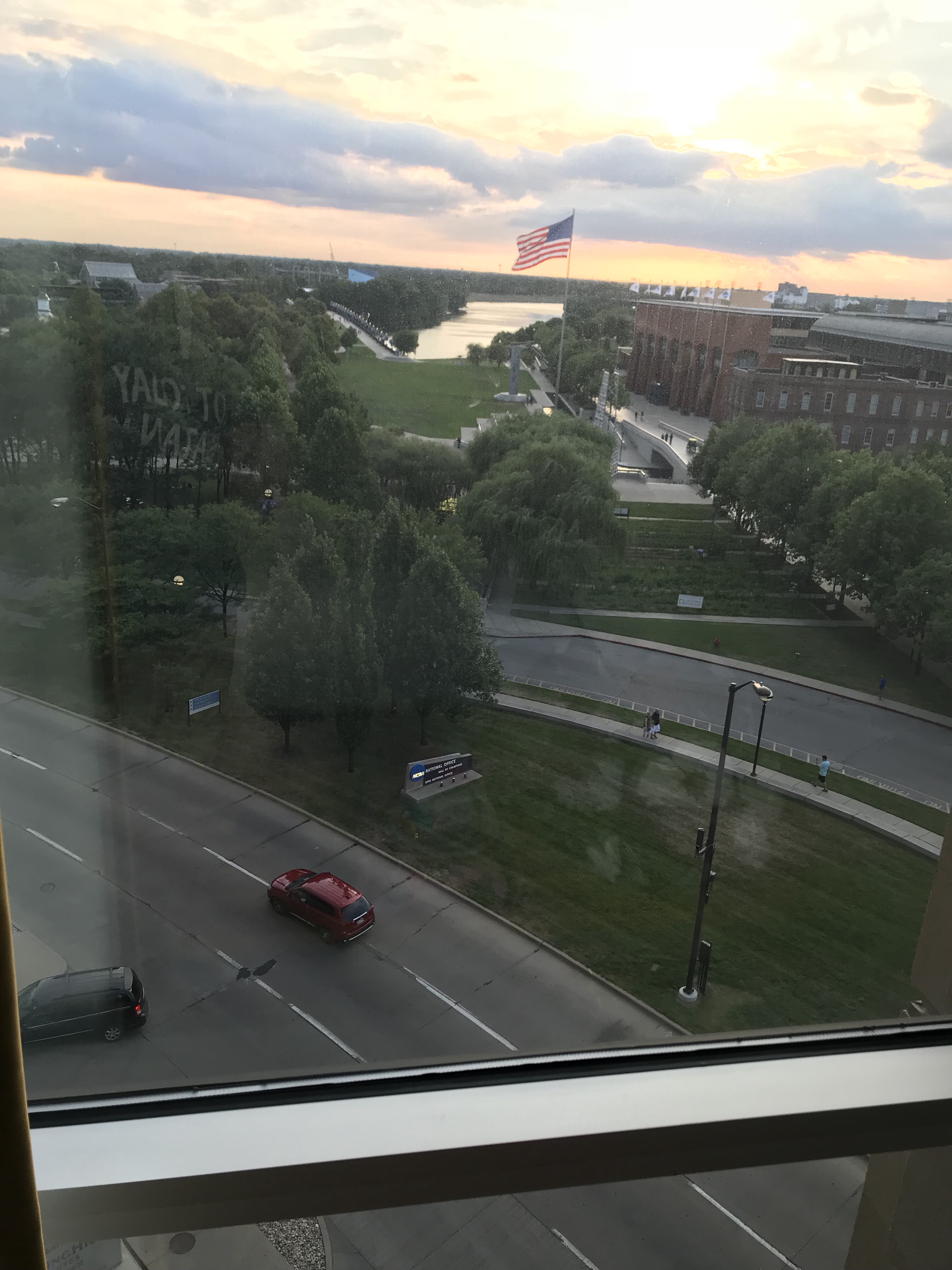 We repacked bags, scurried to find someone to feed our furry best friend for us, and hit the road just before dinner time. I insisted on a detour to the hot soup bar at Kroger so I would have something filling to sip on as the rest of the family chowed down on one of my favorites; Chic fil a. We stopped at the giant candle outlet on the way down, smelled the yummy candles, gawked at the random white peafowl and strange assortment of artisan goods, and arrived in Indianapolis shortly before sunset. The kids were disappointed to learn there wasn’t a pool, and I was thoroughly wiped out, so they headed down to the beautiful college campus/concert venue/park/river walk located 8 floors below our hotel room, and I enjoyed a quiet shower and watching the sun slip down from the sky. It was gorgeous. Every few minutes the colors changed a little more and I just couldn’t look away.